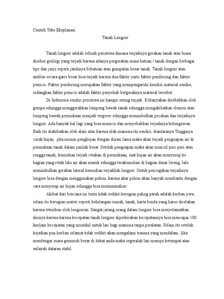 Contoh teks eksplanasi tentang gempa bumi . Berpindah ke teks eksplanasi mengenai peristiwa alam berikutnya yaitu tanah longsor. Fenomena tanah longsor terjadi karena dua. Tanah longsor di sumedang dipicu curah hujan tinggi dan tanah yang tak stabil. Sering dijumpai kata teknis atau peristilahan, sesuai degan topik yang dibahas.